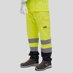 Pantalone da lavoro estivo alta visibilità EN 20471 CL 2 55% cotone 45% poliestere 190gr con bande retroriflettenti, con passanti ed elastico in vita. Chiusura con zip e bottone in plastica. Tasche anteriori con taglio sagomato; una tasca laterale con patta di chiusura LOCK SYSTEM su gamba sinistra; una tasca porta metro a destra. Due tasche posteriori, di cui una con patta e strappo. Cuciture a contrasto. Cavallo e interno gamba a triplo ago.