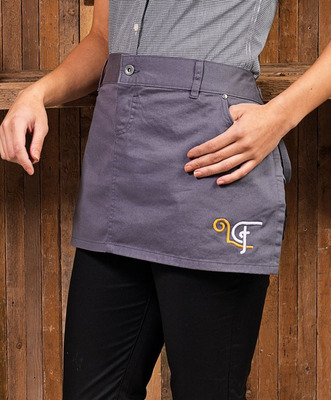 Grembiule con pettorina e grande tasca frontale con rivetti e cuciture, due tasche laterali, cordoncino al collo regolabile e fermabile con bottone a pressione, 100% cotone, 230gr